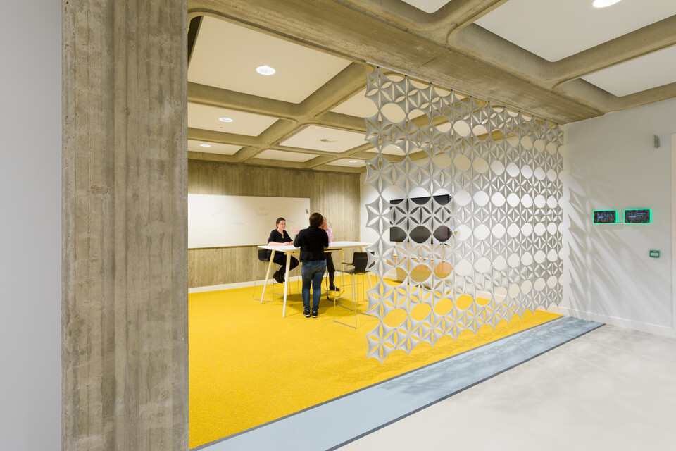 Architect Christiaan Coepijn van Cushman & Wakefield tekende de basis uit. ‘De eerste lijnen die ik op papier zette, zie je nu terug in het vloerenpatroon. Daar sluit alles in het pand op aan. De betonstructuur was mijn startpunt. In alles heb ik geprobeerd om de relatie tussen het nieuwe en bestaande gebouw te leggen.’