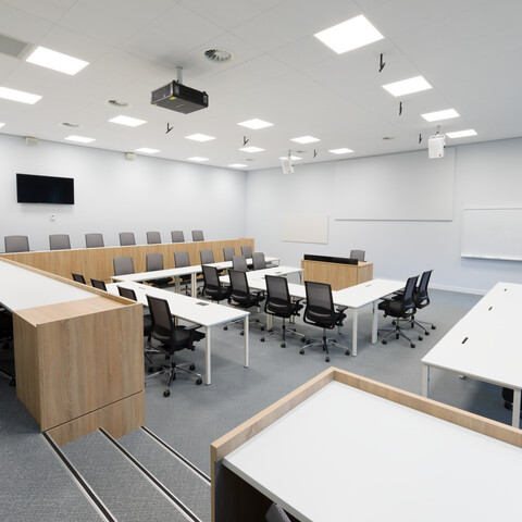 Aan de gevel van het nieuwe TIAS-pand bevinden zich de collegezalen en de break out rooms. Menno Maas: ‘Ook in de collegezalen willen we snel en gemakkelijk andere opstellingen kunnen creëren. Dat vroeg wat van het meubilair.’ State-of-the-art audio en video zorgt ervoor dat studenten en docenten interactief kunnen werken. Tussen de lesruimtes in bevinden zich meer open ruimtes, waar dankzij veel glas toch daglicht binnenkomt. Pantry’s en verrijdbare blokken zijn toegepast om hier ook een lunch of avondmaaltijd te kunnen nuttigen. Men heeft de keuze uit statafels en diverse zitoplossingen. Op de eerste verdieping bevinden zich flexibele werkplekken voor de staf.