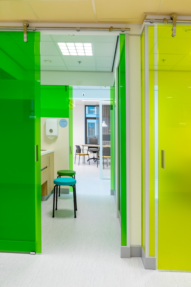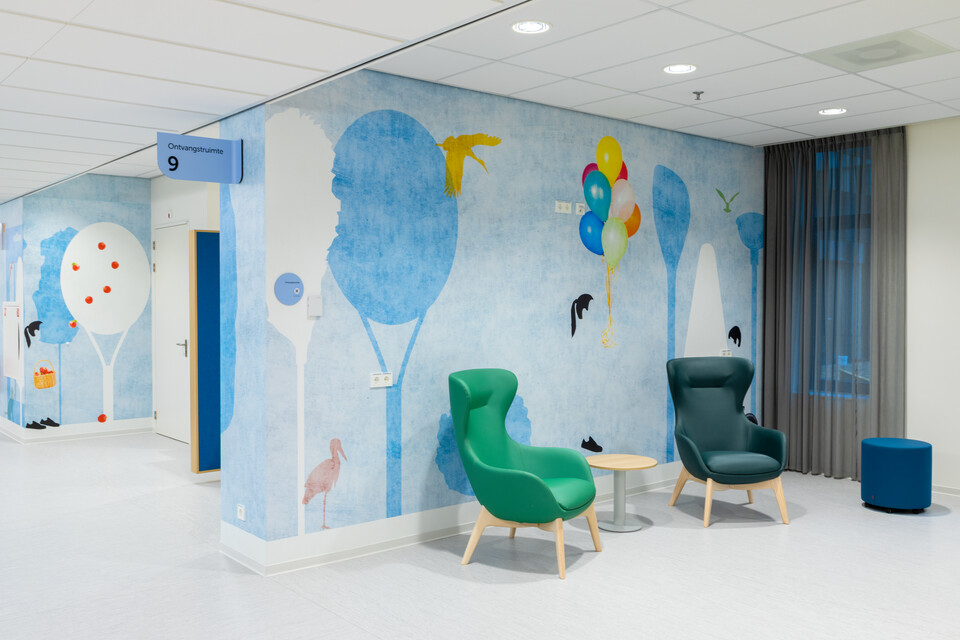 Na een kick-off met het projectteam van Amphia voerde Nelleke zes weken lang gesprekken met mensen uit het projectteam én medewerkers van alle afdelingen die een plek kregen in de nieuwbouw. Nelleke: ‘Wat plaatsen we in welke ruimte, en waar precies? De gebouwarchitect had een globale indeling en kleurstellingen per bouwdeel opgeleverd. Mariska Ek, projectcoördinator interieurontwerp vernieuwbouw bij Amphia, ontwikkelde verschillende belevingsconcepten. Deze vormden mijn uitgangspunt voor de definitieve indelingen, producten, materialisering en kleurvoorstellen. Belangrijk daarbij: elke afdeling heeft een eigen kleurstelling, maar er moet wel ruimte zijn voor uitwisseling. Sommige producten moeten ook op andere plekken in te zetten zijn.’ Mariska: ‘In de patiëntenkamers hebben we voor een rustige basis gekozen. Op de poli’s komt er meer kleur terug, en natuurlijk ook op de kraam- en kinderafdeling. We hebben continu samen naar de juiste balans gezocht: het eindresultaat moet kloppen – zowel esthetisch als functioneel en technisch.’
