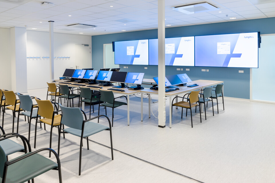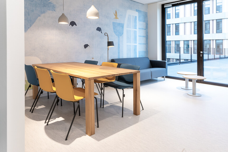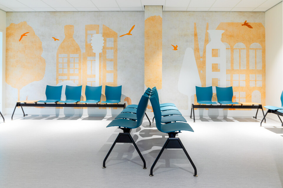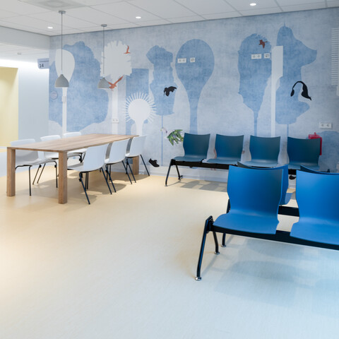 Peter: ‘Een grote wens van Amphia waren extra comfortabele patiëntstoelen op de patiëntkamers. Zo snel mogelijk uit bed komen en in beweging komen, is bevorderend voor het herstel. Stoelen van Prominent en Moments helpen daar nu bij.’ In de spreekkamers staat de TM Doc: een organisch gevormde tafel waaraan je als arts en patiënt echt sámen een behandelplan opstelt, met 4-poot Zinn bezoekersstoelen. In de werkkamers maken artsen en andere medewerkers gebruik van de zeer comfortabele Zinn bureaustoel – Gispen leverde 1.000 stuks. In de centrale entree staan ronde Gispen TEAM tafels met Nomi stoelen eromheen en Casala Corals wachtelementen: een modulair element, telkens weer net even anders toegepast. In de ontvangstruimtes kunnen bezoekers zelf kiezen hoe ze willen zitten. Bijvoorbeeld in een treinbank van Havee, aan de leestafel of bijvoorbeeld in gekoppelde kuipstoeltjes (Casala Onyx Traverses). In diverse ruimtes plaatsten we kindermeubilair, zoals de Gispen Bronto stoeltjes in diverse kleuren en de kunststof puppy’s van Magis. Uiteraard leverde Gispen ook diverse medisch-ergonomische producten, zoals zadelkrukken van Medisit.