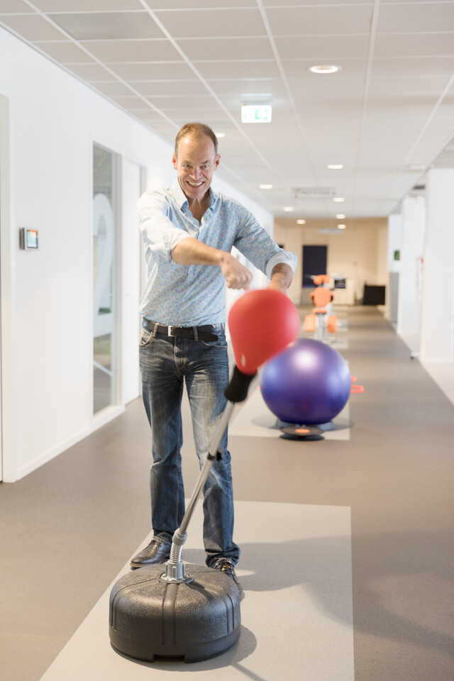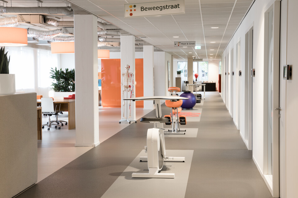De vier werkvleugels worden verbonden door een Beweegstraat: een boulevard met opvallende en ludieke elementen die met fysiotherapie of met gezond werken te maken hebben. Denk aan een Loopbandbureau, Oxidesk en boksbal. De Desk-Bikes die er stonden bevielen zo goed, dat ze inmiddels zijn verhuisd naar de werkgebieden. Marcel Sturkenboom: ‘Onze medewerkers moesten misschien twee dagen wennen, maar zijn nu zeer enthousiast en trots op hun nieuwe werkomgeving.’