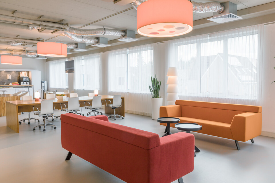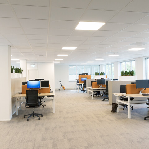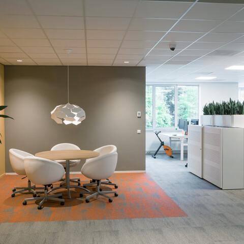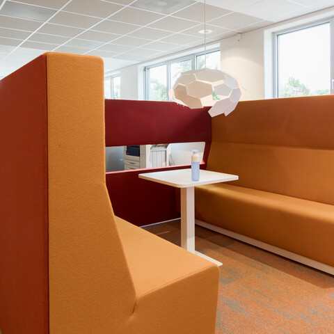 Naast een goede luchtkwaliteit, optimale verlichting en veel groen in de werkomgeving, had akoestiek vanaf het begin de volle aandacht in het ontwerp van Human-Space. Van de kwaliteit van de plafondtegels tot aan de vloerbedekking. John Venneman: ‘Een open kantoor kan enkel toegepast worden als de akoestiek optimaal is’. Gispen realiseerde diverse akoestische voorzieningen. Matthijs Elsing: ‘Tussen de twee werkplekken in een duo-opstelling brachten we gestoffeerde, akoestische tussenschermen aan. Daarnaast voorzagen we oude, bestaande kasten van stoffen hoezen. Deze hoge kasten vormen nu, op hun zijkant geplaatst, akoestische blokken tussen de Zit/Sta-opstellingen. Een mooi voorbeeld van circulair inrichten.’ Gispen leverde verder onder meer de MultiLounge, Sett banken, SDK schuifdeurkast, Nomi vergaderstoelen en Dukdalf bijzettafels. Deze producten zijn onder meer terug te zien in de huiskamer die Gispen inrichtte voor informeel overleg.