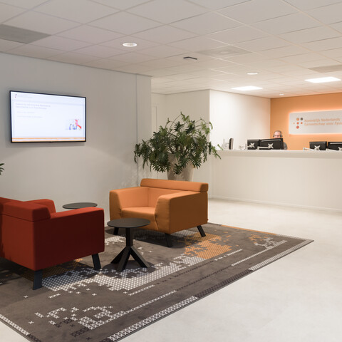 Er zijn vier vleugels met open werkplekken en daarnaast enkele concentratieplekken. Wie koffie wil, loopt naar de centrale huiskamer; de Meet & Greet, waar men ook kan neerstrijken voor een kort overleg of om even te werken. Daaraan grenzend bevinden zich een aantal themakamers. Gesloten ontmoetingsplekken met elk een eigen kleurstelling en sfeer, passend bij de KNGF-thema’s. John Venneman: ‘In een kantoor dat zoveel mogelijk flexibel en open is, kun je zo nog steeds kiezen welke ruimte bij je past.’