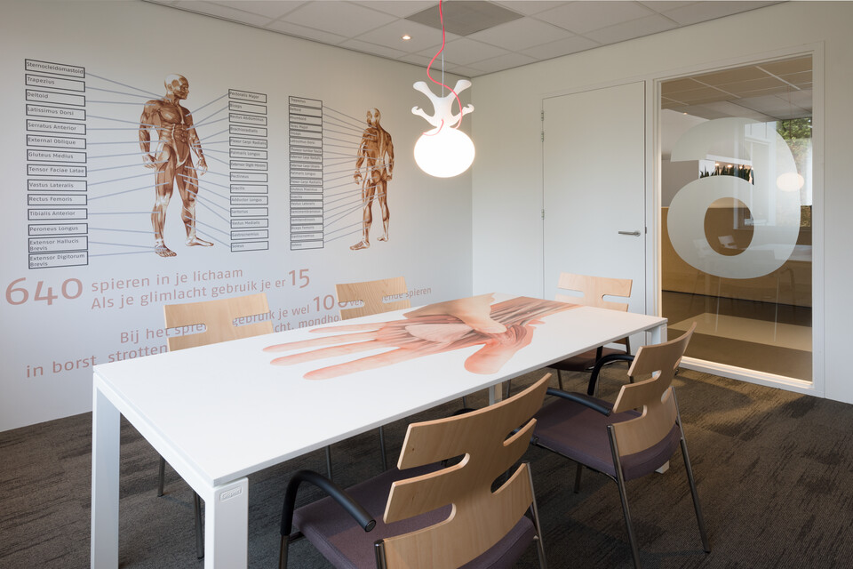 Wij zijn van het bewegen. We stimuleren gebruik van de trap. Op de begane grond is het Fysio Café waar alleen gezonde voeding wordt uitgeserveerd. Daar is ook het nieuwe KNGF Vergadercentrum voor bijeenkomsten van 10-75 deelnemers.’